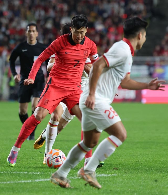 손흥민이 지난 17일 경기 수원시 팔달구 수원월드컵경기장에서 열린 축구 국가대표 평가전 대한민국과 베트남의 경기에서 공격하고 있다. / 뉴스1