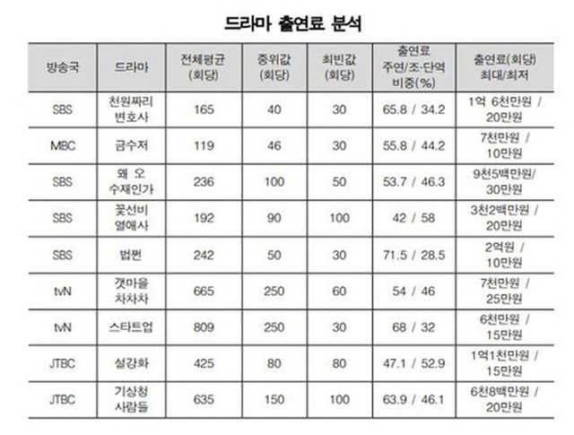 SBS ‘천원짜리 변호사’의 주연배우 남궁민은 회당 1억 6000만 원을 받고 단역 연기자의 최저 출연료는 회당 20만 원에 그쳐 800배의 격차가 있었다.