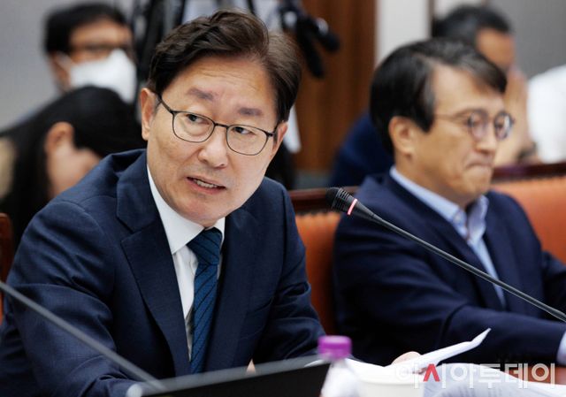 박범계 더불어민주당 의원이 24일 오전 서울 서초구 서울고등법원에서 열린 국회 법제사법위원회의 서울·수원고법 및 서울중앙·인천·수원지법, 서울행정·가정·회생법원 등 17개 기관에 대한 국정감사에서 질의하고 있다. <국회사진취재단>국회사진취재단>