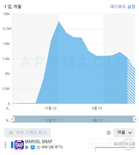 앱 분석 사이트 앱매직 데이터에 따르면, 마블 스냅은 1억 1177억 달러(약 1500억 원)의 매출을 올린 것으로 보인다. 카드게임 치고는 상당한 매출을 올린 것으로, 게임성도 좋았지만 '마블'이라는 IP를 도입한 것도 이번 흥행에 큰 역할을 한 것으로 분석된다.