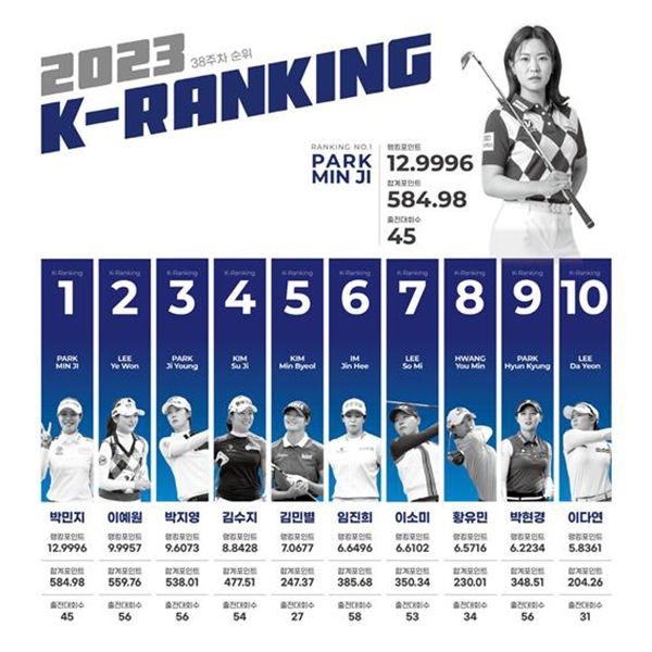 올 시즌 KLPGA 투어가 어느 때보다 치열하게 펼쳐지고 있다. 이런 가운데 국내 투어만의 독자적인 랭킹 시스템인 K랭킹이 또 하나의 흥미 요소와 관전 포인트로 자리 잡았다. 올해 38주 차 기준 K랭킹 1위는 12.9996포인트를 쌓은 박민지(25·NH투자증권)로 123주 연속 K랭킹 1위를 유지하고 있다.