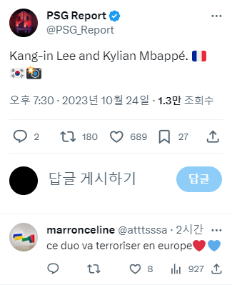 밀란전을 앞두고 진행된 팀 훈련에서 음바페와 이강인 '투샷'이 잡혔다. 두 선수 모두 독기 가득한 눈빛을 품고 정면을 응시하는 모습으로 밀란전에 모든 걸 쏟아붓겠다는 의지가 느껴졌다. PSG 리포트는 "이강인과 킬리안 음바페"라는 문구와 삼색기, 태극기, 카메라 이모티콘을 올렸다.
