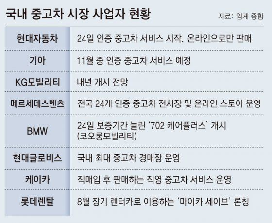 국내 렌터카 시장 점유율 1위(1분기 21.2%)인 롯데렌탈은 앞선 8월 장기 렌터카 형태로 중고차를 제공하는 ‘마이카 세이브’ 상품을 출시했다. 온라인으로만 중고차 서비스를 제공하던 엔카닷컴은 오프라인 매장을 열어 경쟁력 강화에 나섰다. 3월 경기 수원시에 엔카믿고센터 1호점을 연 데 이어 경기 고양시의 일산 매장과 경남의 양산 매장을 추가했다. 엔카닷컴은 고객과의 접점 확대를 위해 오프라인 매장을 더 추가하겠다는 방침이다.