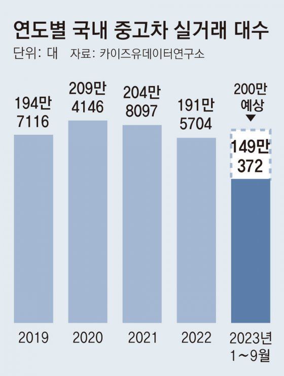 자동차 시장 조사업체 카이즈유데이터연구소에 따르면 올해 들어 9월까지 중고차 실거래 대수는 전년 동기(145만6739대) 대비 2.3% 증가한 149만372대다. 겨울 판매 성수기에 신규 사업자가 늘면서 올해 연간 거래량은 200만 대를 돌파할 것이란 게 업계의 예상이다. 2020년 209만4146대, 2021년 204만8097대, 지난해 191만5704대로 하락세를 보이다 3년 만에 상승세로 돌아서는 것이다.