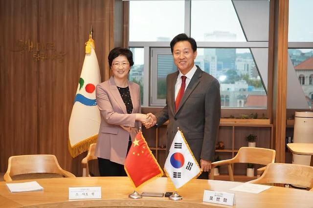 24日,在首尔市政府,首尔市长吴世勋(右)会见中国四川省委副书记、成都市委书记施小琳。【图片提供 韩联社】