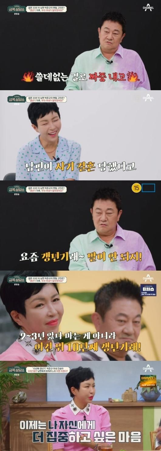박준규는 "아내가 갱년기 이후 많이 변했다"라며 "쓸데없는 걸로 짜증을 내고, 나를 사기 결혼 당했다고도 한다"라고 고민을 토로했다.