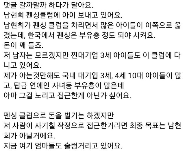 A씨는 "댓글을 달까 말까 고민하다가 남긴다. 남현희 펜싱클럽에 아이를 보내고 있다. 남현희가 펜싱클럽을 차리면서 많은 아이들이 이쪽으로 옮겼다"며 "한국에서 펜싱을 부유층이 시킬 수 있다. 돈이 꽤 든다. 저 남자는 모르겠지만 진짜 재벌 3세 아이들도 이곳에 다니고 있다"고 말문을 열었다.
