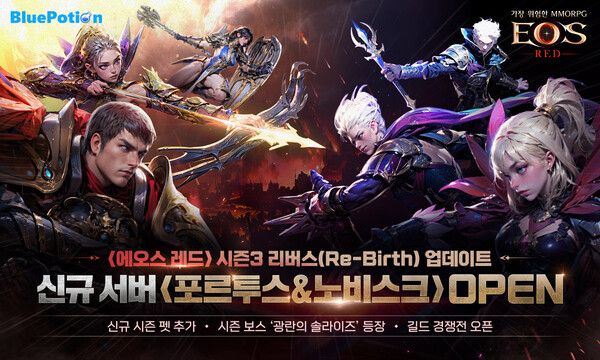 모바일 정통 MMORPG ‘에오스 레드’가 경험치 1,000% 성장특화 서버 ‘포르투스’, ‘노비스크’ 오픈과 함께 시즌 3: 리버스(Re-Birth)를 정식 업데이트 했다.