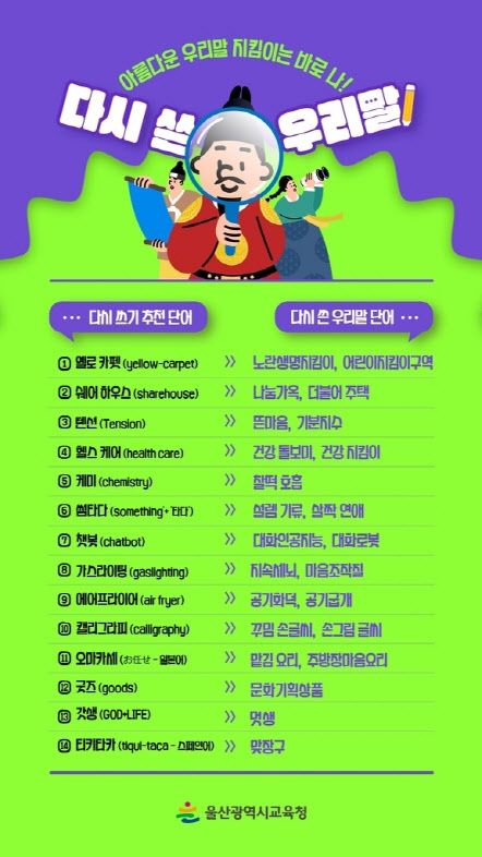 울산 지역 학생들이 제안한 우리말이다. 울산시교육청은 지난 2021년부터 일상에서 무분별하게 사용되고 있는 외래어나 정체불명의 유행어 등을 우리말로 다시 쓰는 사업을 추진 중에 있다. 학생 참여의 우리말 공모도 이의 일환이다. 이같은 자정 노력 덕분에 시교육청은 2021년, 2022년 2년 연속 국어책임관 업무 최우수기관으로 선정됐다.
