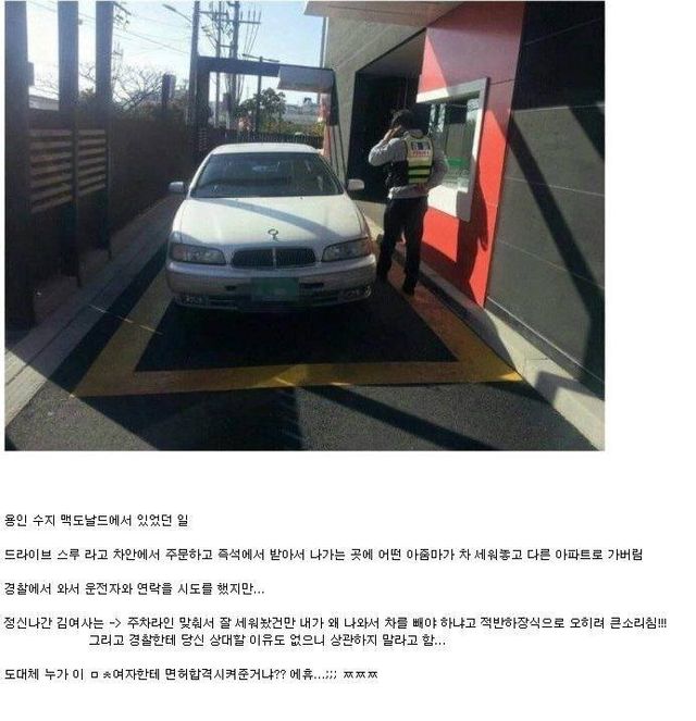 바로 음식을 즉석으로 주문해 받아가는 드라이브 스루 라인을 주차 라인으로 생각해 맥도날드 드라이브 스루를 막은 사건입니다. 경찰이 출동하자 자신은 주차 라인에 주차를 했을 뿐 아무런 잘못도 없다고 화를 냈다고 하네요. 진짜 누가 면허증을 줬을까요...