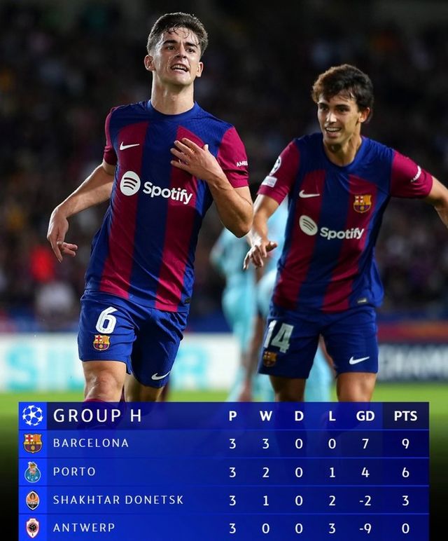 마지막 H조에선 바르셀로나가 3전 전승을 거두며 조 1위 자리를 지켜냈다. 바르셀로나는 매치데이3에서 샤흐타르를 2-1로 꺾으며 확실한 1위를 지켜냈다. 2위는 포르투로 승점 6점으로 추격 중이다.