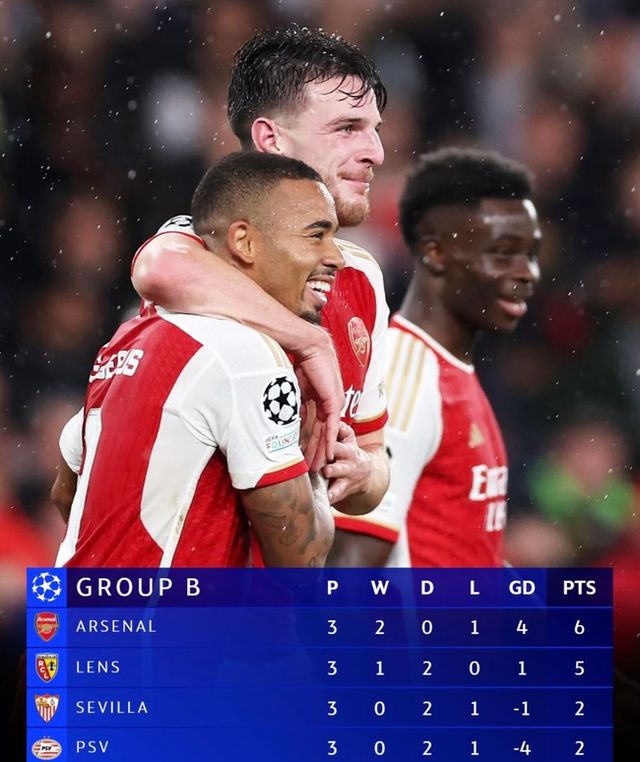 B조에선 아스널이 선두로 치고 나왔다. 아스널은 세비야를 2-1로 제압하며 승점 6점을 쌓게 됐다. 반면 매치데이2에서 아스널을 꺾고 조 1위에 올랐던 RC 랑스는 아인트호벤과 1-1로 비기며 승점 5점으로 조 2위에 위치하게 됐다. 세비야가 3위지만 승점 4점인 만큼 치열한 16강 진출 싸움이 예상된다.