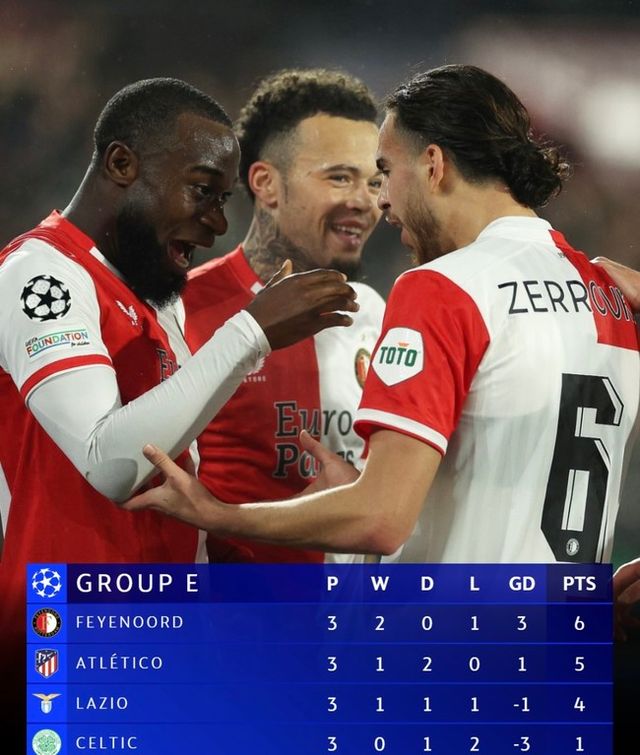 E조의 순위도 흥미롭다. 지난 시즌 네덜란드 에레디비시를 우승한 페예노르트가 승점 6점으로 조 1위 자리를 차지하고 있고, 아틀레티코 마드리드가 셀틱과 2-2로 비기며 승점 5점으로 조 2위에 머물렀다. 라치오는 페예노르트에 패하며 승점 4점으로 3위다. 3팀의 치열한 경쟁이 예상된다. 반면 오현규, 양현준, 권혁규가 뛰는 셀틱은 1무 2패(승점 1)로 조 최하위에 머물고 있다.