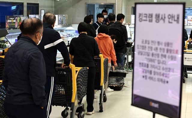 20일 오전 서울 용산구 이마트 용산점 수산식품 매장에서 열린 '반값 킹크랩' 판매행사에서 시민들이 킹크랩을 구입하기 위해 줄을 서고 있다. / 뉴스1