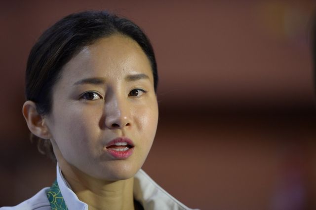 남현희가 2016년 7월 31일(현지 시각) 브라질 리우데자네이루 리우센터 파빌리온에서 취재진과 인터뷰하고 있다. / 뉴스1