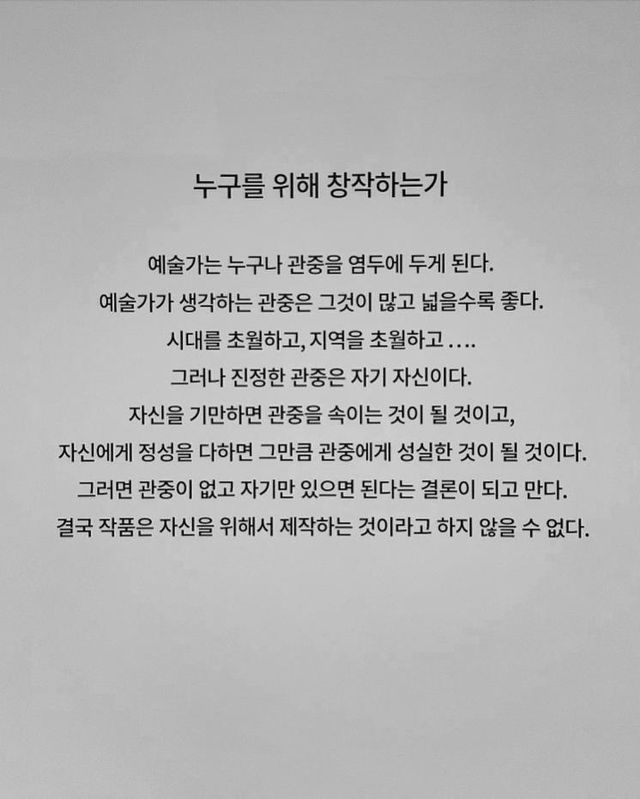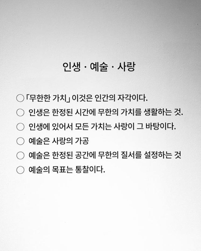 태양은 〈김종영의 조각과 글《인생∙예술∙사랑》〉을 관람했어요. 한국 현대 추상조각의 선구자이자 교육자인 김종영 작가는 생전에 수많은 예술적 영감을 글로 남겼는데요, 이번 전시는 그가 남긴 작품과 어록을 함께 전시해 작가의 예술관을 깊게 이해할 수 있는 통로를 제시합니다. 추상조각만 전시했다면 자칫 모호했을 수도 있는 전시이지만, 작가의 궁극적인 지향점이었던 ‘인생, 예술, 사랑’의 관계에 대한 고민과 예술가로서의 올바른 마음가짐, 한국 미술이 나아갈 방향에 대한 고민을 담은 진지한 성찰이 담긴 글을 함께 전시해 작가와 작품에 대한 이해를 돕는 것이 이 전시의 관람 포인트! 태양도 전시를 관람한 뒤 ‘영감이 가득한 날’이라는 코멘트와 함께 공감 가는 작가의 글을 사진으로 담아 SNS에 저장해 두었어요. 삶의 잔잔한 감동과 울림을 느끼고 싶다면 방문해 보세요. 11월 5일까지.