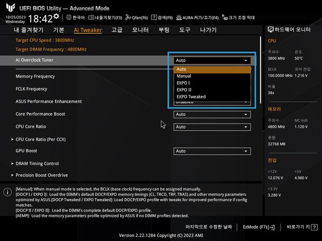 에이수스(ASUS)의 TUF 시리즈 메인보드는 바이오스 기본 화면에서 F7 키를 눌러서 고급 모드(Advanced Mode)로 전환해 EXPO 또는 XMP 기술을 활성화할 수 있다. ‘Ai Tweaker’의 하위 항목인 ‘Ai Overclock Tuner’를 선택하면 메모리에 적용 가능한 기술이 나타난다.