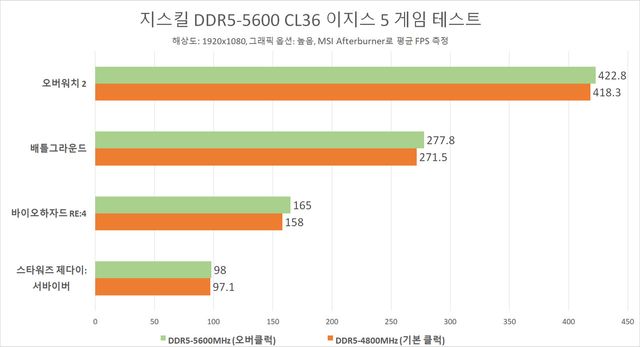 그 다음에는 게임 환경에서 메모리 오버클럭으로 얼마나 성능이 향상되는지 알아보았다. ‘오버워치 2’, ‘배틀그라운드’, ‘바이오하자드 RE:4’, ‘스타워즈 제다이: 서바이버’, 등 PC 게임 네 가지를 선정해 각 게임을 1920x1080(FHD) 해상도에서 그래픽 옵션을 ‘높음’(바이오하자드 RE:4는 ‘균형 중시’)으로 설정하고 MSI 애프터버너(Afterburner)를 이용해 평균 FPS(초당 프레임)를 쟀다.