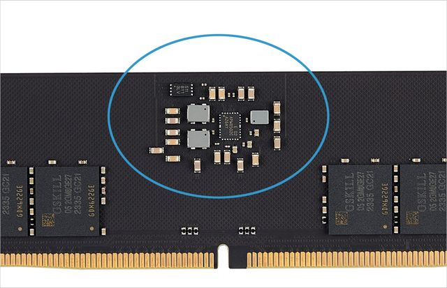 메모리 기판 중앙에는 PMIC(Power Management Integrated Circuit, 전력 관리 직접 회로)가 있다. DDR5 메모리는 정교하게 전력을 관리할 수 있도록 PMIC가 기본 내장된다.
