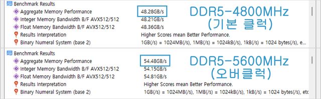 테스트 결과 메모리 대역폭은 기본 클럭에서 48.28GB/s(초당 기가바이트)로 나왔고 오버클럭 시에는 54.48GB/s로 나왔다. 오버클럭을 통해 메모리 대역폭이 약 12.8% 향상된 것이다.