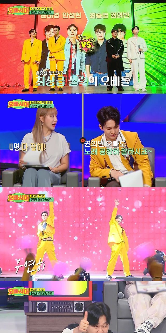 이런 가운데 27일 오후 9시 10분 방송되는 '오빠시대' 4회에서는 결승전 맛보기라 불린 대결이 공개된다. 그 주인공은 '도장 찍고 싶은 오빠' 윤태경과 '섹시한 오빠' 안성현이 결성한 '섹시한 브로' 팀과 '대학로 그 오빠' 최승열과 '강속구 오빠' 권의빈이 함께하는 '스물다섯 마흔다섯' 팀이다. 이들 모두 1라운드부터 화제가 된 오빠들로, 나르샤는 "결승이야"라며 놀라워한다.