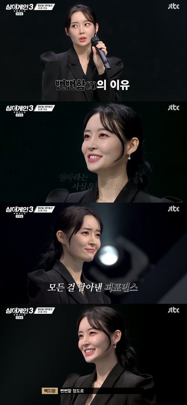 백지영은 "뻔뻔할 정도로 자신감 있는 눈빛이 인상적이었다. 또 감동하고 감격했다. 엄마와 나 사이에서 어느 것 하나 포기한 게 없더라. 멋졌다"라고 말했다.