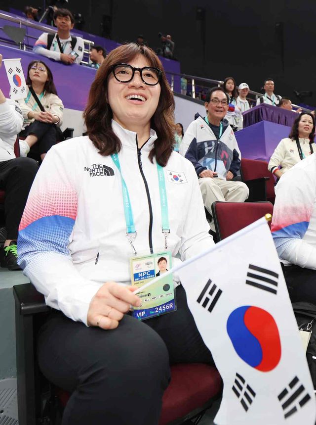 장미란 문체부 제2차관이 지난 22일 항저우 궁수 캐널 스포츠파크 체육관에서 열린 2022 항저우 장애인아시아경기대회 탁구 경기에 출전하는 대한민국 선수들을 응원하고 있다. / 뉴스1