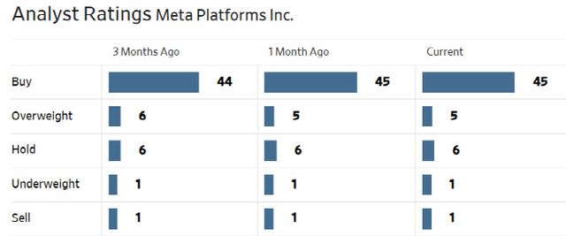 한편 월가에서 메타에 대해 투자의견을 제시한 애널리스트는 총 58명으로 이 중 50명(86%)이 매수의견을 유지하고 있다. 평균 목표주가는 374.8달러로 이날 종가보다 30% 높다. 메타 주가가 올 들어 140% 가까이 급등했음에도 30% 더 오를 수 있다고 평가한 셈이다.