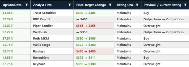 하지만 월가 분위기는 달랐다. 파이퍼샌들러(목표가 365→355달러)와 바클레이즈(410→400달러) 등 목표가를 소폭 낮춘 곳도 있지만 트루이스트(390→405달러), 웰스파고(372→380달러), 로젠블랫(372→411달러), 키방크(356→380달러) 등 목표가를 상향한 곳이 더 많았고 대부분 ‘매수(비중확대 및 시장수익률 상회 등 포함)’ 의견을 그대로 유지했다.
