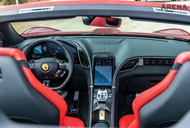 다음 날 아침. 해가 뜨자 호텔 발코니 너머로 엔진 사운드가 들려왔다. 올 것이 왔구나. 로마 스파이더 시승은 두 시간대로 나뉘어 진행됐다. 오전은 영국인이, 오후는 한국인이 타는 일정이었다. 호텔 주차장으로 나가보니 로마 스파이더가 도열해 있었다. 색상은 두 가지. 셀레스테 트레비와 로쏘 포르토피노다. 그중 내가 타기로 한 차는 로쏘 포르토피노였다. 로마 스파이더는 로마의 후속작이다. 페라리는 전통적으로 쿠페 버전을 먼저 출시하고 추후 같은 차의 스파이더 버전을 출시해왔다. 그 때문에 페라리는 대부분 쿠페 모델을 개발할 때부터 스파이더의 가능성을 염두에 둔다. 처음부터 그 가능성을 생각하지 않으면 나중에 스파이더 버전을 제작할 때 과정이 훨씬 복잡해지기 때문이다.로마 스파이더는 페라리의 최신 모델인 동시에 가장 ‘요즘 차 같지 않은 차’이기도 하다. 이유는 간단하다. 페라리가 그렇게 의도했기 때문이다. 페라리 로마는 1950~60년대 로마의 풍요롭던 라이프스타일을 재해석해 만든 차다. 로마 스파이더는 하드톱이 아닌 소프트톱을 얹었다. 페라리 프론트 엔진 모델에 소프트톱이 올라간 건 1969년 출시된 365 GTS4 이후 54 년 만이다. 물론 여기에는 최신 기술이 들어간다. 소프트톱은 로마 스파이더 전용으로 새롭게 개발한 테크니컬 패브릭으로 완성했다. 손으로 쓰다듬으면 두꺼운 청바지를 만지는 느낌이다. 붉은빛 소프트톱은 야외에서 보는 각도에 따라 색깔이 진해지거나 연해진다. 성능은 로마 쿠페와 동일하다. 3.9L V8 트윈 터보 엔진 F154와 8단 듀얼 클러치 변속기가 탑재되고 최고출력은 620마력에 달한다. 정지 상태에서 100km/h까지 걸리는 시간은 3.4초. 최고속도는 320km/h다.