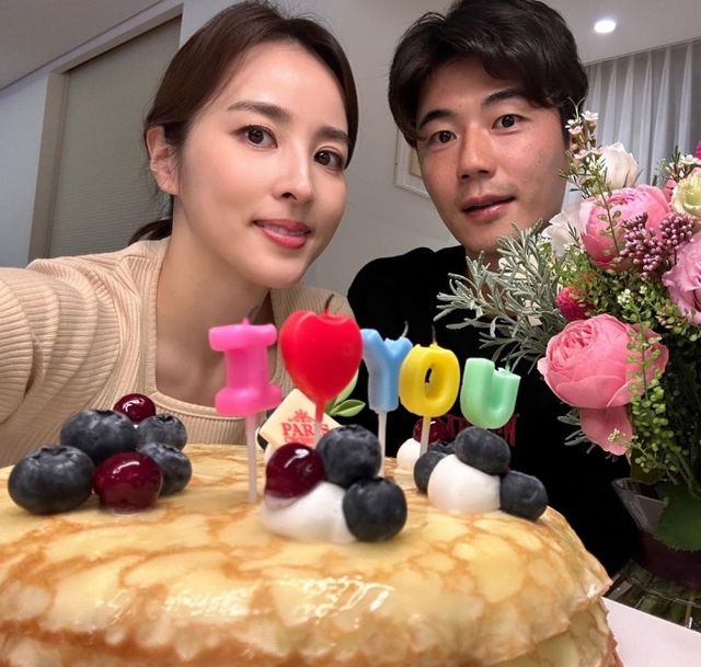 사진 속에는 한혜진, 기성용 부부가 생일케이크와 꽃다발을 앞에 두고 웃고 있다.