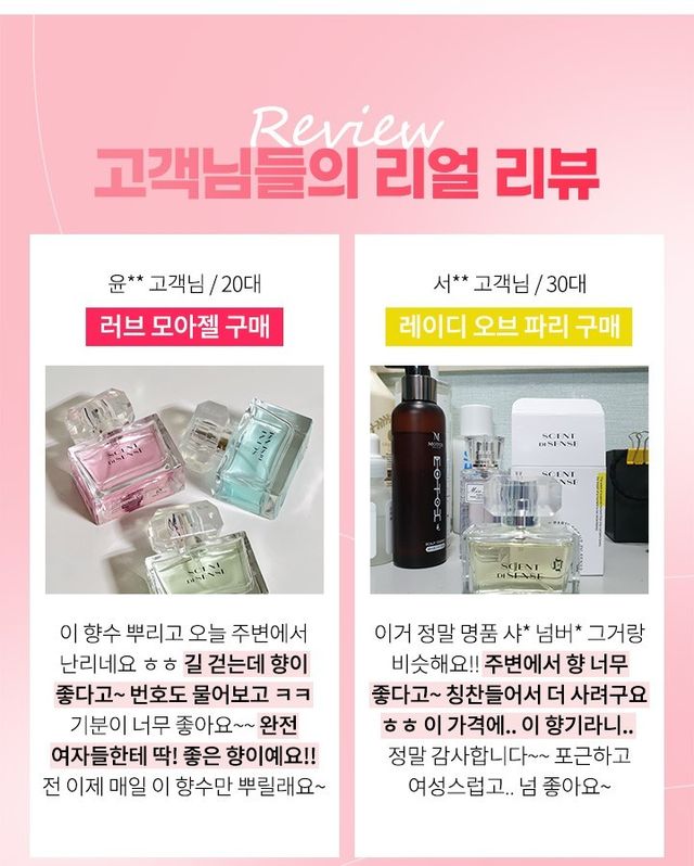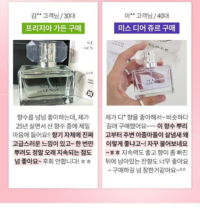 향수를 잘못 선택하게되면 처음부터 너무 진해 하루종일 머리아픈 향수가 있다. 반면 센트디센스 퍼퓸은 지금까지 써본 명품 향수들에 뒤지지 않고 향기나, 지속성, 잔향까지 만족해 니치향수, 여자 향수로 추천한다.