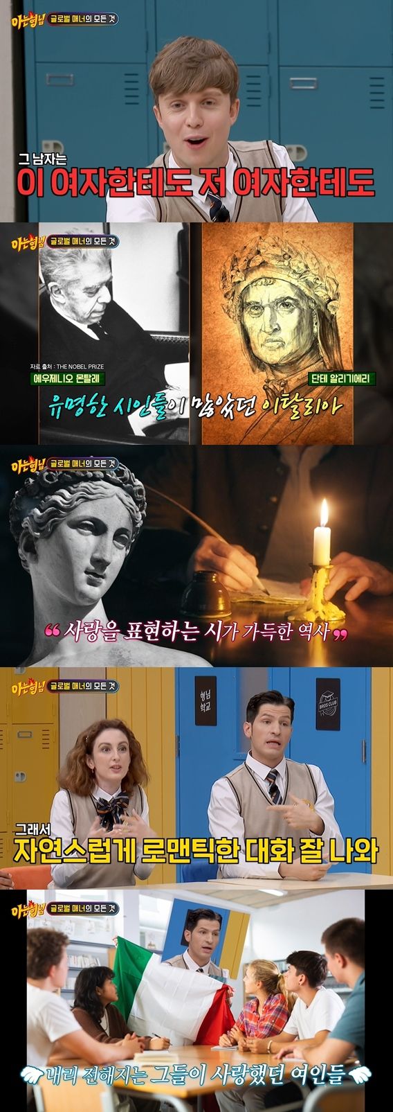 이들은 이탈리아 사람들이 말을 잘하는 이유가 유명한 시인들이 많았기 때문이라고 설명했다. 이탈리아에는 역사적으로 사랑에 관한 시가 많다며, 자연스럽게 로맨틱한 대화 잘 나오게 된다고 했다. 알베르토는 본인이 학창 시절 배웠던 이탈리아 시는 모두 여자 얘기였다고 해 웃음을 안겼다.