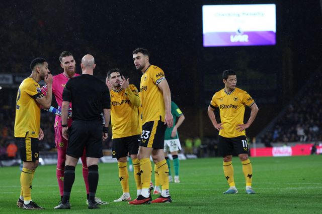 울버햄프턴 선수단이 주심의 PK 판정에 항의하고 있다. 사진=AFPBB NEWS