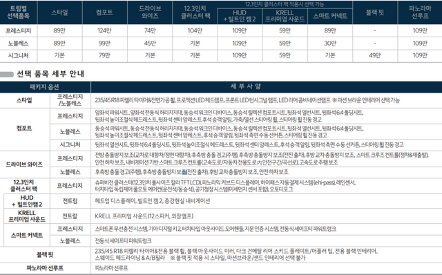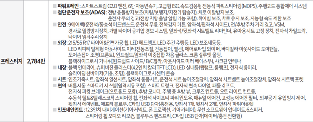 기존 엔트리 트림인 트렌디가 삭제되고 프레스티지부터 제공되면서 시작가격이 2.0 가솔린 기준 366만원이나 높아진 만큼 가성비 옵션에 대한 선호도가 더욱 높아질 것으로 보인다.