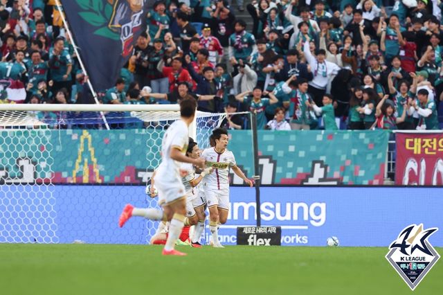 대전은 29일 수원월드컵경기장에서 열린 수원삼성과의 '하나원큐 K리그1 2023' 35라운드 맞대결에서 전반전에 2골을 내줬지만 후반 36분 티아고의 만회골과 추가시간에 터진 마사의 극적인 동점골에 힘입어 2-2 무승부를 거뒀다.