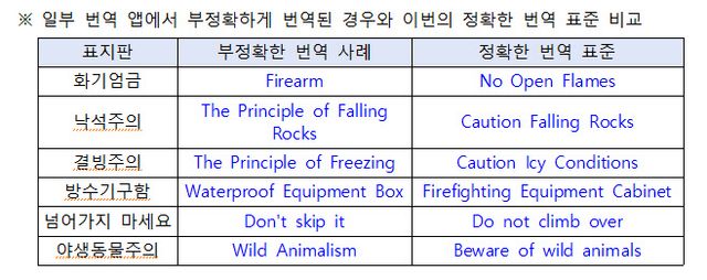 나아가 표지판에는 일상생활에서 쓰지 않는 어려운 한자어를 순화하고, 쉬운 우리말을 사용하도록 각 기관에 표지판 정비를 요청했다. 또 국민 누구나 쉽게 검색해 활용할 수 있도록 지난달 말에 네이버 사전 앱에 번역 표준을 공개하고, 지난 20일에는 공공데이터포털 누리집에 공개해 기업들도 활용할 수 있도록 했다.