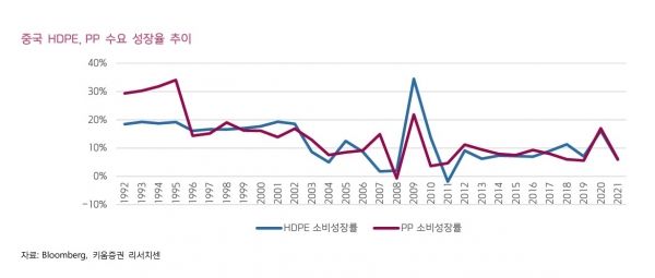 1) 국채 1조위안 발행규모는 ‘22년 중국 GDP 비중 1% 미만 수준으로 이에 따른 GDP 개선 영향은 제한적일 듯. 2) HDPE, PP 등 주요 범용제품의 중국 소비 비중은 34%, 41%로 단일국가로 가장 높은 수준, 그러나 GDP 성장율이 과거 대비 안정화되며, 수요 성장율 역시 하락 안정화 추세. 3) DOW는 ‘23년 1~8월 미국 PE의 역외 수출은 YoY +21%로 언급, 저가 Ethane gas based 미국 PE 제품은 아시아 시장 경쟁 고조로 이어질 수 있음. 4) ‘20년~’21년은 팬데믹에 따른 포장, 일회용 수요 증가로 PE, PP의 단기 수요 성장 나타났으나, 엔데믹에 따른 정상화 단계.