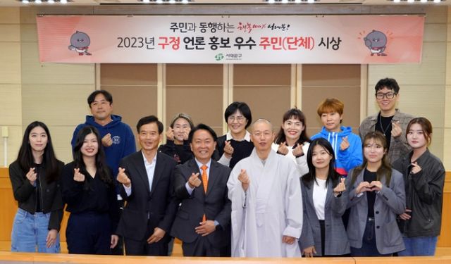 | ▲ 이성헌 서대문구청장(앞줄 왼쪽 네 번째)과 구정언론홍보 표창 수상자들이 기념 촬영을 위해 손가락 하트 모양을 만들어 보이고 있다. |