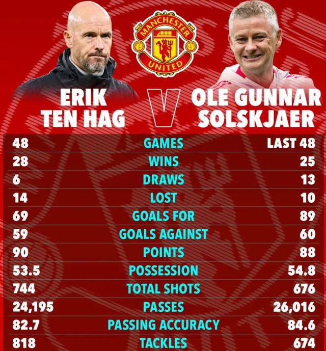 솔샤르의 맨유는 패스와 빌드업 전개 과정을 강조한 턴 하흐보다도 높은 공 점유율과 패스 횟수, 패스 정확도를 보이며 여러 수치에서 나은 모습이었다. 더선은 "턴 하흐 밑에서 맨유는 744개의 슛을 시도했지만, 솔샤르 시절 676번의 슈팅을 시도했을 때보다 20골이나 적은 득점을 기록했다"라며 턴 하흐의 맨유가 기록 중인 부진한 공격력을 지적했다.