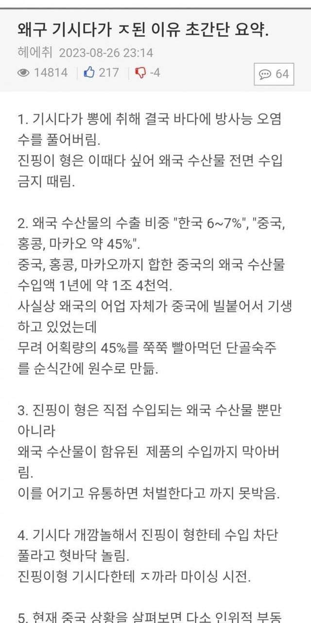 4 시진핑이 요때다 하고 오염수 방류 꼬투리 잡고 미국 꼬봉 일본의 수산물을 시작으로 전분야 수입금지 가능