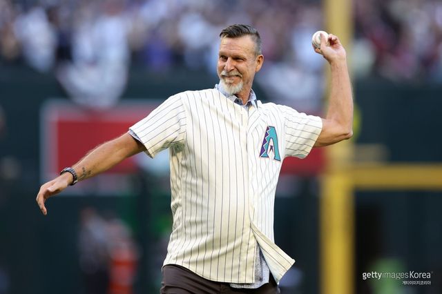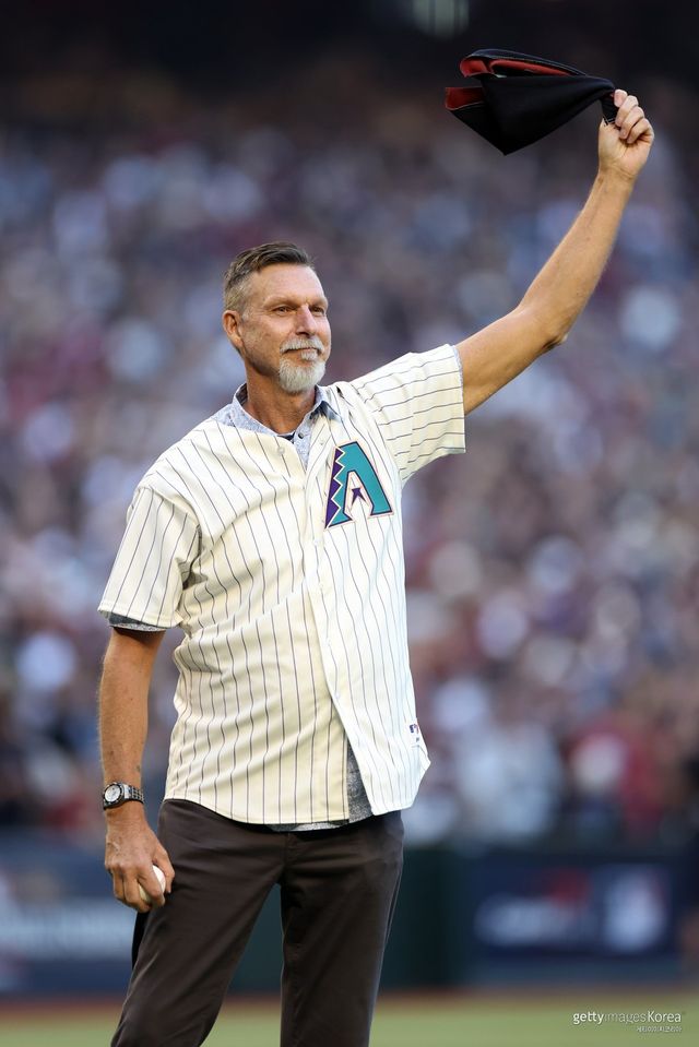 지난 2001년 월드시리즈의 영웅 랜디 존슨이 다시 최고의 무대 마운드에 섰다. 22년 전에는 선수로, 22년 후에는 시구자로 공을 던졌다.