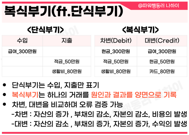 보기만 해도, 복식부기가 더 복잡해보이지 않나요?