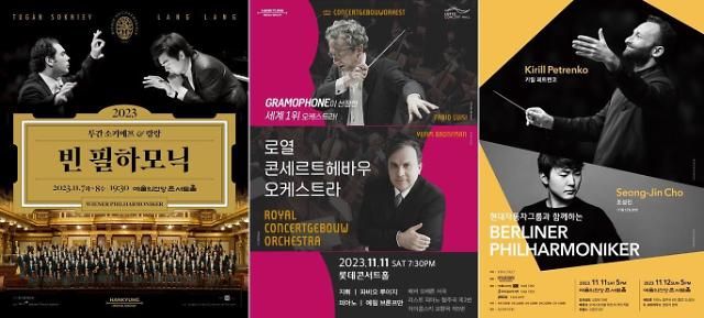左起依次为维也纳爱乐乐团、荷兰皇家大会堂管弦乐团和德国柏林爱乐乐团韩国演出海报。【图片提供 韩联社】