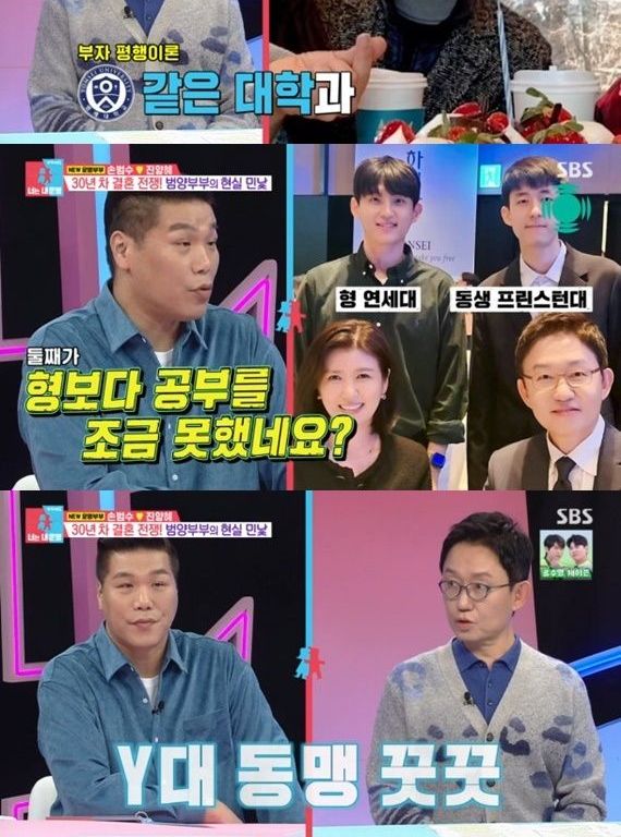 손범수는 함께 거주 중인 큰아들에 대해 "저와 같이 연세대를 졸업하고, 공군 장교 다녀온 뒤 취업한 지 2년 됐다"라고 전했다. 잦은 밤샘 때문에 얼굴 보기가 힘들다고. 이어 손범수는 "둘째는 2000년생, 프린스턴대학교 3학년이다"라며 미국 유학 중인 둘째 아들을 언급했다. 이에 손범수와 같은 연세대 출신 서장훈이 "동생이 형보다 공부를 조금 못했네요?"라고 너스레를 떨며 손범수와 연세대 동문으로 뭉쳐 웃음을 자아냈다.