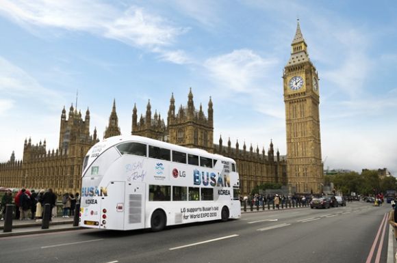 '엑스포 버스'는 런던 시내 곳곳을 돌아다니며 런던 시민뿐 아니라 런던을 찾은 관광객에게 부산엑스포 유치를 홍보하고 있다. LG그룹은 버스 광고에 부산의 매력을 직관적으로 느낄 수 있도록 부산의 영문 알파벳(BUSAN) 속에 △해운대 마천루 △광안대교 △해동 용궁사 △다이아몬드타워 △다대포 해수욕장 등 부산의 대표 랜드마크를 담았다.