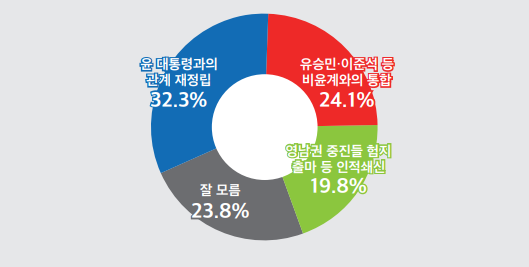 이어 "유승민, 이준석 등 비윤(비윤석열)계와의 통합"은 24.1%, "영남권 중진들의 험지 출마 등 인적 쇄신"은 19.8%로 나타났다. 응답을 유보한 층은 23.8%였다.