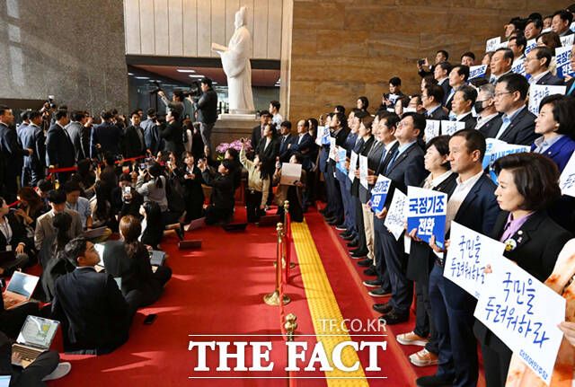 홍익표 더불어민주당 원내대표를 비롯한 의원들이 31일 국회 로텐더홀에서 윤석열 대통령의 국회에 도착에 맞춰 피켓 시위를 하고 있다.
