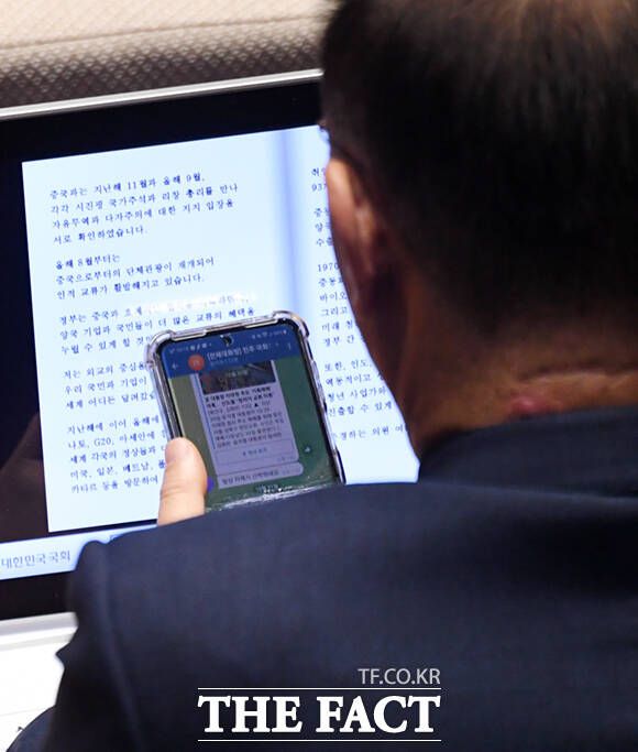 윤석열 대통령이 31일 오전 서울 여의도 국회 본회의장에서 2024년도 예산안 및 기금운용계획안에 대한 시정연설을 하는 가운데, 김윤덕 더불어민주당 의원이 휴대전화로 민주당 전체 의원 대화방에 올라온 윤 대통령 관련 기사를 살펴보고 있다. /국회=이새롬 기자