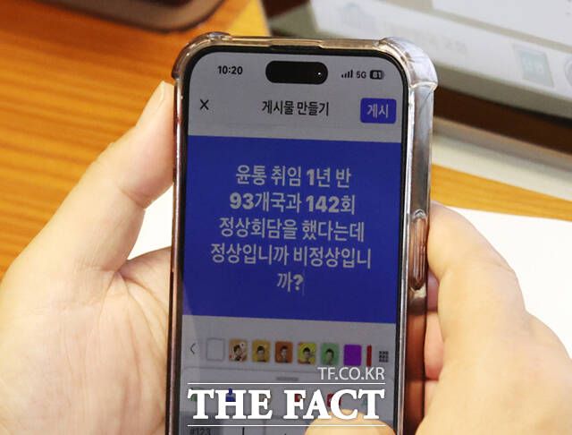 박찬대 더불어민주당 최고위원이 31일 오전 서울 여의도 국회 본회의장에서 윤석열 대통령의 2024년도 예산안에 대한 시정연설을 들으며 자신의 SNS에 "윤통 취임 1년반 93개국과 142회 정상회담을 했다는데 정상입니까 비정상입니까"라는 글을 작성하고 있다.